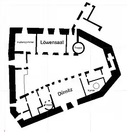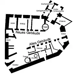 Für das Jahr 1630 ist eine Inventarliste bekannt, nach der das Schloss über etwa 50 Räume verfügte: Gemächer und Stuben, Vorgemächer, von denen aus die Öfen der Stuben und Gemächer betrieben wurden (Öhrn), sowie weitere Kammern. Der Schlosshof hatte zwei Zugänge, einen von der Stadtseite (Westen) durch den alten südlichen Flügel sowie einen von Osten durch einen Torturm. Im Erdgeschoss befanden sich die Kanzlei, die Backstube (Pfisterei) mit Mehlkammer, die große Schlossküche mit Geflügelkammer und Wildbrettkammer, die Metzig (Schlachterei) und ein Keller. In den oberen Etagen befanden sich die Wohnräume und Säle. Diese waren der Löwensaal im Nordflügel und die Dürnitz im Südflügel. Zu den ständigen Schlossbewohnern gehörten der Hausschneider, der Torwart[A 2] und das Gesinde.[5]