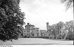 Das Schloss war in seiner Namenssymbolik für die Nationalsozialisten von großer Bedeutung, denn in ihrer völkischen Ideologie missfiel ihnen der slawische Ortsname Nowawes. Aus diesem Grund wurde die 1938 mit Neubabelsberg vereinigte Stadt nach dem Schloss umbenannt. Der Name Babelsberg wurde einer germanischen Sprache zugeschrieben. Tatsächlich leitet sich der Wortteil Babel jedoch von dem ebenfalls slawischen Wort Bobe ab, was so viel wie Biber bedeutet[120] und sich auf die an der Havel ursprünglich zahlreich vorkommenden Nager bezog. Seit einer weiteren Eingemeindung 1939 gehört das Schloss wie ganz Babelsberg zur Stadt Potsdam.[121]