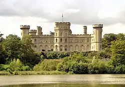 Das Schloss lässt sich der Burgenromantik und Mittelalterbegeisterung des 19. Jahrhunderts zuordnen.[125] Als Vorbild dienten meist nicht „echte“ Bauwerke aus dem Mittelalter, sondern zeitgenössische englische Landsitze, die den früheren gotischen Tudorstil nachahmten. Durch Kupferstiche wurden diese adligen Anwesen auch in Kontinentaleuropa bekannt. So ließ sich Schinkel maßgeblich von dem ab 1824 umgestalteten Windsor Castle inspirieren.[126] Babelsberg spielte in dieser Hinsicht eine besondere Rolle, denn anschließend entstand in Kontinentaleuropa eine Reihe stilistisch ähnlicher Residenzen, die sich an Windsor Castle anlehnen. Dazu zählen unter anderem Schloss Hohenschwangau bei Füssen, Schloss Pierrefonds bei Compiègne und Schloss Marienburg bei Hildesheim.[127] Nach Meinung von Gottfried Riemann stellt Schloss Babelsberg zusammen mit Schloss Hohenschwangau für die neogotische Architektur in Deutschland eine Zäsur dar. Zwar bauten deutsche Landesherren bereits Ende des 18. Jahrhunderts, etwa im Wörlitzer Park, in diesem Stil. Die neogotischen Gebäude blieben jedoch meist noch bloßes Zierwerk und hatten keinen „unmittelbaren Nutzcharakter“. Erst mit Schloss Babelsberg sei die Schwelle hin zu neogotischen Wohnbauten erreicht worden.[128] Babelsberg weist typische Elemente der Romantik und Neogotik auf, etwa die unregelmäßige Höhe der Türme, Erker und Zinnen. Englisch inspiriert sind insbesondere die alle Bauteile umlaufende Zinnenbekrönung, der unregelmäßige Grundriss und die rechteckigen zwei- oder dreiteilig gegliederten Fensterrahmungen.[129] Viele Anregungen könnte Schinkel dem von Humphry Repton verfassten Architekturmusterbuch Fragments on the theory and practice of landscape gardening entnommen haben. Der Bauforscher Manfred Klinkott vermutet, dass Augusta ihm dieses Werk empfahl.[130] Von Bedeutung für Schloss Babelsberg ist vor allem eine architektonische Idealdarstellung nach Seite 20. Das Blatt mit dem Untertitel A design to exemplify irregularity of outline in castle Gothic (Ein Entwurf zur Veranschaulichung der Unregelmäßigkeit des Umrisses in der Burggotik) wirbt im Unterschied zu Windsor Castle für ein asymmetrisches Modell, das Schinkel aufgriff.[131] Als weitere mögliche Vorbilder gelten Eastnor Castle, Gwrych Castle und East Cowes Castle.[132]