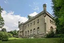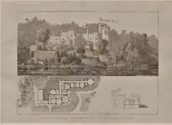 Als möglicher Architekt für den Schlossbau kam der Bauinspektor und ehemalige Schinkelschüler Ludwig Persius in Frage. Ende der 1820er Jahre hatte er während des Umbaus der Schlösser Charlottenhof und Glienicke in Zusammenarbeit mit seinem Lehrmeister Schinkel erstmals eigenständige architektonische Akzente gesetzt.[15] Den Vorstellungen Augustas versuchte Persius in einem Entwurf von 1831 entgegenzukommen. Er schlug eine kubische Bauform mit Spitzbögen und Zinnen vor.[16] Der Entwurf lehnte sich an die italienische Burgenarchitektur des Mittelalters an.[17]