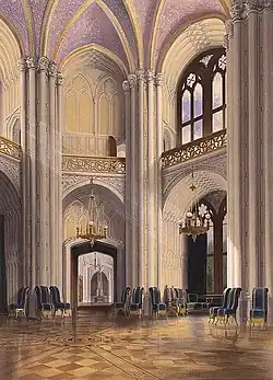 Im Erweiterungsbau von Persius und Strack lagen die beiden Hauptrepräsentationssäle: der Tanzsaal und der Speisesaal. Wie der Teesalon war auch der Tanzsaal in einem – allerdings größeren – Oktogonturm untergebracht. Der Raum bildet das Zentrum des Schlosses und verbindet den unter Schinkel errichteten alten Schlossflügel mit dem Anbau. Das Rippengewölbe des Saals versah Strack mit einer Ausmalung, die sich an mittelalterlichen Handschriften orientierte: Musik spielende Putten und Blätterverzierungen verweisen dabei auf die Funktion als Festsaal des Schlosses. Der Tanzsaal erstreckt sich über zwei Stockwerke. Im oberen Bereich umrundet eine Empore den Saal, von der aus Wilhelm seine Privatgemächer im Obergeschoss erreichen konnte.[162] Die Empore wurde von den Chorumgängen in Kathedralen inspiriert. Unterhalb der Fenster und der Empore ermöglichten Nischen den Gästen einen Rückzug aus dem Hauptgeschehen der Feierlichkeiten. Sie konnten dort auf Stühlen Platz nehmen und zur Konversation übergehen.[163] Die meisten höfischen Festivitäten zur Zeit Wilhelms fanden allerdings in dem damaligen königlichen Palais in Berlin statt. Dort wurden während jeder Wintersaison ein bis zwei Hofbälle veranstaltet.[164] Bekannt ist, dass Wilhelm und Augusta am 11. Juni 1854 in Schloss Babelsberg ihre Silberhochzeit begingen: Hier empfing das Prinzenpaar feierlich die königliche Familie und besuchte anschließend einen Gottesdienst in der Potsdamer Friedenskirche.[165]