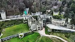 Um das Schloss herum legte Lenné ab 1833 einen englischen Landschaftsgarten an, den Park Babelsberg. Dieser grenzt im Westen an den Tiefen See der Havel und im Norden an den Glienicker See an. 1842/1843 übernahm Fürst Pückler die Gestaltung des zu den Seen abfallenden, hügeligen Geländes.[112] Er ließ Lennés Wegenetz erweitern und stellte die Wasserversorgung der Fontänen, Brunnen, Wasserfälle und Bäche durch ein 20 Kilometer langes System unterirdischer Wasserleitungen sicher. Mittels einer Dampfmaschine im Maschinenhaus des Parks wurde das erforderliche Wasser aus der Havel abgepumpt.[113] Zur Zeit des Schlossbaus war das Gelände, auf dem Schloss Babelsberg entstand, noch nicht in die Stadt Potsdam eingemeindet.[114] Die Residenz lag in der Nähe der ehemaligen Kolonistensiedlung Nowawes.[115]