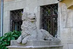 Auf der Porzellanterrasse standen ursprünglich viele Tierplastiken. Den Zweiten Weltkrieg überdauerten davon unter anderem drei steinerne Hundefiguren: die Darstellung einer Bulldogge, eines Neufundländers und einer Ulmer Dogge.[184] Erstere steht am nordwestlichen Rand der Terrasse und wird der deutsch-amerikanischen Bildhauerin Elisabet Ney zugeschrieben. Deren Urheberschaft ist jedoch nicht sicher, da die Inventarakten des Schlosses die Skulptur nicht erwähnen.[185] Die Künstlerzuordnung beruht ausschließlich auf der Beobachtung, dass ein im texanischen Elisabet Ney Museum ausgestelltes Gipsmodell der Steinplastik stark ähnelt und möglicherweise als Vorlage diente. Nach Einschätzung der Kunsthistorikerin Dagmar von Stetten-Jelling könnte Ney die Skulptur 1896 bei einer Deutschlandreise verkauft haben. Die „Bulldogge“ wurde nach dem damals neuartigen Steingussverfahren angefertigt.[186] Die Darstellung ist nach Meinung der Kunsthistorikern Sibylle Einholz Tyras, dem Hund von Neys Vater, nachempfunden.[187] Die Stiftung Preußische Schlösser und Gärten schreibt auch die anderen Hundeskulpturen Ney zu.[188]