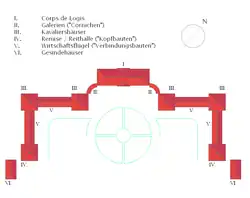 Die vier den Hof auf nördlicher Seite begrenzenden Pavillons dienten ursprünglich als Kavaliershäuser, das heißt, sie enthielten Wohnräume für Gäste und Familienmitglieder. Dem Zweck als Wohnbauten dienten sie über 200 Jahre, wobei sich die Funktion durchaus wandelte. Der östliche Pavillon, rechts des Corps de Logis, diente zum Beispiel beim Tod eines der Majoratsherren als Witwensitz und im westlichen Pavillon befanden sich nach der Wende zum 20. Jahrhundert die Arbeitsräume des Rentmeisters und seines Sekretärs sowie das Gutsarchiv.[40] Die insgesamt vier Verbindungsriegel des Schlosshofs waren nicht für Wohnzwecke vorgesehen, sondern enthielten als Wirtschaftsflügel unter anderem Stallungen, Scheunen und Lagerräume. Die abschließenden Pavillons, die auch als Kopfbauten bezeichnet werden, dienten als Wagenremise und Reithalle und unterscheiden sich durch ihre laternenartigen Dachreiter und hohen Portale von den übrigen vier Pavillons. Vermutungen, dass die Reithalle einst eine Schlosskapelle enthielt oder als solche vorgesehen war, können nicht belegt werden. An die Kopfbauten an den äußeren Enden des Schlosshofs grenzen zwei Gesindehäuser, die einst mit dem eigentlichen Schlosskomplex durch gemauerte Portale verbunden waren.