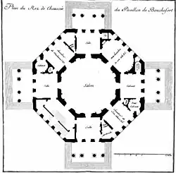 Der Grundriss, der erst 1745 veröffentlicht wurde, zeigt einen regelmäßigen achteckigen Zentralbau, der von kreuzförmig vorgelagerten Treppen mit Portikus erschlossen wird. Der überkuppelte Mittelsalon ist ringförmig von den Wohnräumen des Paares umgeben.