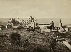 Die Anlage wurde aber nicht vollständig aufgegeben, sondern diente weiterhin als Sitz des bergischen Kellners, der von dort die umliegenden herzoglichen Besitzungen verwaltete. Schon für das Jahr 1301 ist ein bergischer Kellner auf Schloss Burg verbürgt.[16] Er nahm dort nicht nur verwaltungstechnische Aufgaben wahr, sondern fungierte auch als Richter für die Burg und das Amt Bornefeld.[17] Außerdem nutzen die Herzöge von Berg die Anlage weiter als Jagdschloss und für zeremonielle Zwecke. Um 1500[18] ließ Wilhelm von Jülich-Berg den Palas genannten Saalbau durch seinen Amtmann Johann von Stynen[19] aus- und umbauen, um eine standesgemäße Beherbergung der zahlreichen Gäste bei Jagden und Feiern gewährleisten zu können. Die schmalen Lichtschlitze des Baus wurden durch größere Fenster ersetzt, und der Ausbau des Dachgeschosses zu Gästezimmern stellte einen hohen Wohnkomfort sicher. Außerdem war die Schlossküche im Erdgeschoss des Palas zu klein geworden und wurde nach Süden um etwa vier Meter[20] verlängert. Den Anbau ließ von Stynen nicht nur im Erdgeschoss vornehmen, sondern gleich über die gesamte Höhe des Palas ausführen. Die Lage der alten Außenmauern ist im Inneren durch Bogenstellungen zu erkennen. Viele neue und dekorative Gestaltungsmerkmale wie zum Beispiel Fachwerkaufbauten, Erker und Türmchen lockerten das zuvor strenge, militärische Äußere der Anlage auf und verwandelten die Burg allmählich in ein Schloss. Ab jenem Umbau bürgerte sich entsprechend die Bezeichnung „Schloss“ für die Anlage ein, während für die umliegende Siedlung der Name Burg beibehalten wurde. Daraus resultiert der heutige Name der Anlage: Schloss Burg.[21] Zu den zahlreichen Festlichkeiten, die in Burg begangen wurden, gehörte die Kinderverlobung auf Schloss Burg gemäß der Klever Union: Am 25. November 1496 wurde das einzige Kind Wilhelms von Jülich-Berg, die fünfjährige Maria, bei einer Kinderverlobung dem sechsjährigen Johann dem Friedfertigen von Kleve-Mark versprochen.[22] Mit der Hochzeit der beiden, die am 1. Oktober 1510 in Düsseldorf gefeiert wurde, kam es zum Vollzug des Eheversprechens. Mit dem Tod von Herzog Johann II. von Kleve-Mark am 15. März 1521 wurde die 1496 in den Blick genommene Personalunion der Herzogtümer Jülich-Kleve-Berg schließlich Realität, nachdem dessen Sohn Johann nach dem Tod Wilhelms von Jülich-Berg am 6. September 1511 bereits die Erbfolge in Jülich-Berg angetreten hatte.