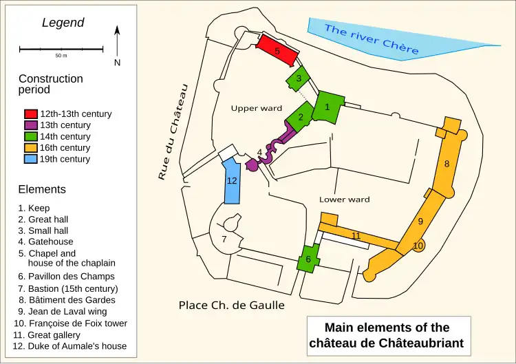 Die Burg wurde im Laufe des Mittelalters mehrmals umgebaut und die Stadt Châteaubriant entwickelte sich an ihrer Seite. Während der Guerre folle s wurde die Burg nach einer Belagerung von den Franzosen eingenommen. Der Bergfried und die teilweise zerstörten Säle wurden im Flamboyant-Stil renoviert. Im 16. Jahrhundert erhielt das Schloss schließlich sein endgültiges Aussehen, als der neue Renaissance-Palast an die mittelalterliche Ringmauer angebaut wurde.
