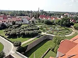 Das aus Broderieparterres gebildete Rondell im nördlichen Teil des Gartens bestand aus vier gleich großen Quartieren, die als Zierbeete angelegt waren. Die Einfassungen dieser Beete bildeten Stachel- und Johannisbeersträucher sowie Lavendel, Baldrian und Salbei.[23] In der Mitte des Rondells befand sich vermutlich eine größere Statue oder ein Brunnen als ein prägnanter Point de vue.[24] Dass die Zierbeete von Carl in vier Quartieren zu einem Rondell angeordnet wurden, ist auf die Lage des zur Verfügung stehenden Grundstücks zurückzuführen. Neben diesem Rondell hatte er für die südliche Ecke des Gartengrundstücks ein trapezförmiges, heute nicht mehr erhaltenes Tapis vert geschaffen, das als symmetrisches Beet zwei Akanthusornamente aufwies. Diese auch Boulingrin genannten einfachen Rasenflächen wurden für Ballspiele der herzoglichen Familie und ihrer Gäste benutzt.[24] Im gesamten Gartenareal, vor allem an den Enden der Alleen und in der Mitte des Rondells, waren insgesamt zehn Vasen, zwei große und 14 kleine Statuen sowie sechs Sitzbänke aus Stein aufgestellt.[24] An einem Teil der Gartenmauer, die zugleich die Stadtmauer bildete, waren Weinstöcke gepflanzt. Am 16. März 1693 spazierte Christiane von Sachsen-Merseburg das erste Mal durch ihren Lustgarten.[24] Während des Aufenthaltes von Herzogin Henriette Charlotte im Schloss Delitzsch betreute der Schlossgärtner J. M. Purths die barocke Grünanlage.[25]
