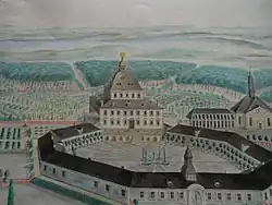 Die Gegend um das heutige Schloss nutzte König Christian V. gerne für die Jagd. Sein Sohn Friedrich IV. ließ an der Stelle des damaligen Hofs Østrup zwischen 1720 und 1722 eine kleine Sommerresidenz und Jagdschloss erbauen. Architekt war der Hofgärtner Johan Cornelius Krieger. Das damals noch kleine Schloss besaß eine annähernd quadratische Grundfläche, hatte nur anderthalb Stockwerke und war mit einer Kuppel überwölbt. Der achteckige Platz vor dem Schloss wurde mit niedrigen Gebäuden für die Dienerschaft umgeben.[1] Entsprechend dem französischen und italienischen Stil grenzte das Schlösschen direkt an den Garten, der bis zum Ufer des Esromsees reicht. Krieger legte den Barockgarten entlang der Jagdwege von Christian V. an.[2] Der Name Fredensborg (Friedensschloss) soll an den zwischen Dänemark und Schweden geschlossenen Frieden nach Ende des Großen Nordischen Krieges erinnern.