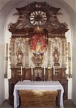 Das Altarbild der Kirche zeigt neben Maria und Jesus den gekrönten St. Oswald mit dem Raben. Zwischen den gewundenen Säulen befinden sich Statuen der Heiligen Gotthard und Benedikt, an den Seiten des Altars Statuen des heiligen Wolfgang und eines Schutzengels.