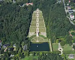 Das Schloss war ehemals von weiteren Gärten umgeben. Südlich vor der Schlossinsel befand sich der so genannte Westergarten, der im 16. Jahrhundert unter Herzog Adolf angelegt wurde. 1623 bis 1637 entstand östlich des Schlosses, in Richtung des Wikingturms, der in die Schlei hineinragende Alte Garten.[63] Für dessen Anlage gewann Herzog Friedrich III. den Gärtner Johannes Clodius (1584–1660).[64] Der Garten wurde im 18. Jahrhundert nur noch als Küchengarten genutzt und enthielt auch mehrere Fischteiche. An diese formal gestaltete Grünanlage erinnert heute lediglich noch der Straßenname „Alter Garten“.[65] Zeitlich gleich im Anschluss an diesen Garten entstand ab 1637 das Neue Werk, ein Terrassengarten nördlich des Schlosses, ebenfalls durch Johannes Clodius.[64] Der Bildhauer Zacharias Hübener gestaltete hierfür 20 Statuen und 10 Löwen. Ab 1707 entstand auf dem Gelände des Westergarten das Palais Dernath mit einem französischen Barockgarten, entworfen von Johann Christian Lewon (um 1690–1760).[66] An Stelle des 1868 abgebrannten Palais erhebt sich das Schleswig-Holsteinische Oberlandesgericht, von der Bevölkerung auch „Roter Elefant“ genannt.[67] Der Bau entstand 1875–1878 nach Plänen von Landbaumeister P. E. P. Köhler.[68]