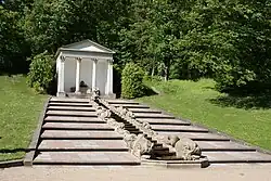 Vom Schloss führt eine 300 Meter lange, auf einem Damm gelegene Allee durch den Burgsee auf eine tempel- und delfingeschmückte Kleine Kaskade zu. Der daran anschließende Neuwerkgarten des Gottorfer Schlosses gilt als erster barocker Terrassengarten nördlich der Alpen.[44] Das „neue Werk“, die jüngste der das Schloss einst umgebenden Grünanlagen, war lange Zeit nur in Fragmenten zu bewundern. Ab 1984 begann die Wiederherstellung der Gartenanlagen mit der Restaurierung der kleinen Kaskadenanlage.[45] 1991 entstand das erste Parkpflegewerk für einen historischen Garten in Schleswig-Holstein, bearbeitet von Rose und Gustav Wörner, das die weitere Entwicklung der Wiederherstellung des Gartens vorbereitete und mit dem EU-Gelder eingeworben werden konnten.[46] Die Wiederaufstellung der Replik der Herkulesgruppe[47] im Sommer 1997 in der Mitte des zwei Jahre zuvor ausgehobenen Herkulesteiches stellte einen ersten Höhepunkt der denkmalpflegerischen Bemühungen dar.[48]