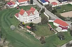 „Der älteste Teil ist der Südflügel, in dem ein spätgotischer Kernbau aus der Zeit um 1450 steckt, während der Nordflügel mit seinen vier runden Ecktürmen... aus der Zeit um 1560 stammt. Beide Gebäude waren durch einen ursprünglich ebenerdigen, Anfang des 17. Jahrhunderts auf drei Geschossen erhöhten Gang verbunden.“[1]