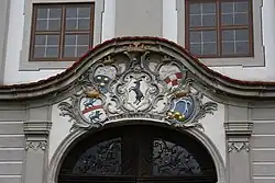 Über der Toreinfahrt des Schlosses enthält eine stuckierte Kartusche mehrere Wappen, in der Mitte das Wappen derer von Riedheim, seitwärts davon die Wappen der Adelsfamilien Stauffenberg, Hornstein, Giel und Freyberg, Geschlechter, die mit den Riedheims verschwägert waren.