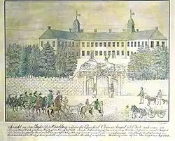 Der Kurfürst ließ 1753 ein repräsentatives Eingangstor aus Rüthener Sandstein erbauen. Der Entwurf geht auf Johann Conrad Schlaun zurück, der plastische Schmuck wurde von Johann Christoph Manskirch geschaffen. Das Tor besteht aus drei Teilen. Neben einem breiten Mitteltor gibt es zwei kleine Eingänge. Auf dem Tor befinden sich zwei Jagdszenen. Am Tor selbst befinden sich einige Reliefs: auf der rechten Seite ein größeres kurfürstliches Wappen, auf der linken Seite der verschlungene, mit Jagdemblemen geschmückte Namenszug „CA“. Auf der Innenseite steht links die Titelei des Bauherrn: