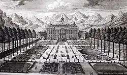 Der Bau des Schlosses wurde am 12. Mai 1712 mit der Grundsteinlegung begonnen und um 1719 beendet. Dabei wurde das alte, 1701 von Michael Wening dargestellte Burgschloss als Steinbruch verwendet. Gestalterisch ist der Bau dem Frühbarock zuzurechnen. Der prächtige Schlossgarten nach Versailler Muster wurde von Matthias Diesel angelegt, der ihn auch in einem Stich darstellte. Da von einem französischen Garten keine Spuren mehr vorhanden sind, wurde dieser Stich und der abgebildete Garten in Zweifel gezogen. Tatsächlich zeigt aber auch die Uraufnahme Anfang des 19. Jahrhunderts einen französischen Garten. Auf der Votivtafel zum Einfall der Tiroler während der Napoleonischen Kriege ist der Schlossgarten als eingefriedeter englischer Rasen abgebildet.
