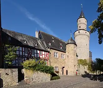 ![]() Fachwerkbau der Alten Burg (Oberburg) mit Altem Amtsgericht (mittig) und dem alten Bergfried, heute Hexenturm genannt | ||