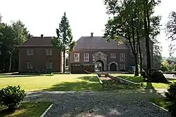 Südlich des Herrenhauses steht ein zweiflügeliger Gebäudekomplex, der einst die Ökonomiegebäude des Schlosses beherbergte. Von seinem Westflügel führt eine lange, steinerne Bogenbrücke in den restaurierten Barockgarten nach französischem Vorbild. Dort umfassen vier symmetrisch angelegte Beete ein kreisrundes Wasserbassin in ihrer Mitte. In der Umgebung liegt ein Wirtschaftsgebäude und ein ehemaliges Gewächshaus, das 2010 zu einem normalen Wohnhaus umgebaut wurde. Zudem befindet sich hinter der 0,62 Hektar großen Wiese, ein Friedhof der vorherigen Besitzer und ein kleiner Forellensee. Neben der großen Rasenfläche und südlich vom Barockgarten liegt ein großer Tennisplatz und ein kleines Haus mit einem Pool.