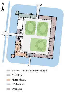 Der aus unverputztem Ziegelmauerwerk errichtete Wirtschaftshof, auch Vorburg genannt, belegte früher den östlichen Teil der Nord- und Südflügel sowie den gesamten Ostflügel der Anlage. Im Erdgeschoss fanden sich dabei Vieh-, Schaf-, Wilden- und Pferdeställe sowie der herrschaftliche Pferdestall, Sattelkammer, Kutscherzimmer und Putzzimmer. Nach Aufgabe der Landwirtschaft wurden einige Ställe zu einer Wagenremise und Reithalle sowie zu einem Holzlager umgebaut. In den Obergeschossen lagen die Unterkünfte für Pferde- und Viehknechte, Stallpersonal und sonstige Bedienstete wie zum Beispiel den Oberförster, dessen Wohnung 1807[93] eingerichtet wurde. Sie wurden in den 1960er Jahren zu Wohnungen ausgebaut. Im östlichen Vorburgflügel befand sich zudem eine große Getreidescheune. An der Südost-Ecke der Gebäude befindet sich im Obergeschoss ein kleiner Erker, der schon auf der Roidkin-Zeichnung des 18. Jahrhunderts zu sehen ist und damit zum Baubestand der Barockanlage gehört. Er war früher vermutlich höher als das Dach und diente als Ausguck.[94][95] Die südliche und östliche Außenfassade ist am Trauf- und Sockelgesims mit einem einfachen Zahnfries verziert, der sich zum Teil auch an den hofseitigen Fassaden findet. Früher waren alle Seiten des Wirtschaftshofs damit verziert.