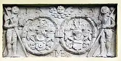 An der abgeschrägten Südost-Ecke des Schlosses befindet sich im zweiten Obergeschoss ein großer Panorama-Balkon, unter dem das steinerne Allianzwappen der Familien von Reichenbach und von Ratschin hängt. Es zeigt die Jahreszahl 1583, wurde allerdings erst im 20. Jahrhundert an seinem heutigen Platz angebracht.[3] Eine weitere Wappendarstellung findet sich im skulptierten Dreiecksgiebel eines Eingangs im Nordflügel. Der verwitterte Stein zeigt unter anderem das Reichenbach-Wappen, die Jahreszahl 1612 und den Namen „CHRISTOF FRIEDRICH (von) REICHENBACH“.