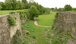 Das als Zitadelle ausgebaute Schloss hatte eine Grundfläche von 2,5 ha. Schloss und Ort waren mit Befestigungsanlagen und spitzwinkligen Bastionen umgeben. Dazu wurden Wälle aus Erde errichtet und mit tiefen Wassergräben umgeben. Ort und Schloss mit einer Grundfläche von 10 ha waren umgeben von einem mauergestützten Wall von 1.800 m Länge. Die Mauern hatten eine Höhe von 9 m bei einer Stärke von 2,3 m. Der gesamte Wall hatte eine Breite von 37–42 m. Der Aufbau der gesamten Festung entsprach den Anforderungen, die die Entwicklung von Pulvergeschützen hervorgerufen hatte. Als Vorbild dienten Bastionärsbefestigungen in Italien und den Niederlanden. Herzog Erich II. machte sich Anlagen zum Vorbild, die er während seiner Söldnerdienste im spanisch-niederländischen Krieg in Antwerpen gesehen hatte. Mit dem Bau waren italienische Ingenieure beauftragt, die auch an anderen Orten wirkten. Heute sind im Bereich des Schlosses von der Festungsanlage nur noch die Südbastion sowie eine etwa 100 m lange Kasematte erhalten. Die Reste der Erichsbastion am Nordrand der Stadt wurden teilweise wieder ausgegraben.