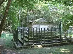 Den Ort für seine Begräbnisstätte hat Feldmarschall Laudon selbst festgelegt. Zunächst war dafür eine Anhöhe über dem damaligen Tiergarten angedacht (daher stammt die Statue im Schlosspark). Später entschied sich Laudon für einen Platz im „türkischen Gärtchen“. Dort wurde er auch tatsächlich, nachdem seine Leiche aus Neutitschein nach Hadersdorf überführt worden war, beigesetzt.[7] Die unterirdische Gruft war anfangs nur mit einem einfachen Erdhügel überdeckt. Laudon hatte sich gewünscht, dass sein Grabmal aus den von ihm aus Belgrad mitgebrachten türkischen Steinen zusammengefügt werden sollte. Seine Witwe Klara verweigerte aber nachträglich diesen Plan und ließ stattdessen bei dem Bildhauer Franz Anton Zauner ein klassizistisches Grabmal in Auftrag geben, das 1791 fertiggestellt wurde. Es hat die Form eines Quaders mit einem Giebeldach und ist auf allen vier Seiten mit Relief-Tondi mit mythologischen Figuren geschmückt. An den beiden Längsseiten befinden sich lateinische Inschriften: Eine Widmung von seiner Witwe und seinen Erben (… coniux … ac haeredes pos[uerunt] MDCCLXXXX – errichtet von der Witwe und den Erben 1790) und eine Würdigung seiner militärischen Verdienste (tiro ad Borysthenem, dux ad Moraviam, Viadrum, Boberim, Neissam, Vistritiam; veteranus ad Unnam, Istrim, Savum – als Rekrut an den Dnjepr, als Anführer an die March, Oder, Bober, Neisse und Bystritza, als Veteran an Una, Donau und Save). Neben dem Grabmal befindet sich als Grabwächter die lebensgroße Figur eines trauernden Ritters.