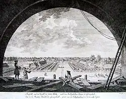 Um in der eigentlich trockenen Region der Griesen Gegend ausreichend Wasser für die Fontänen und Kaskaden zur Verfügung zu haben, wurde von 1756 bis 1760 der 28 Kilometer lange Ludwigsluster Kanal von der Stör bis zur Rögnitz ausgehoben.[57] Er diente zugleich als Transportweg für das benötigte Baumaterial der 1764 begonnenen Arbeiten.[3] Zur Unterbringung eines Wasserbehälters und der Pumpenanlagen für die Fontänen entstand 1751–1753 im hinteren Parkbereich ein Fontänenhaus nach Plänen von Legeay. Das Fontänenhaus gilt als ältestes Gebäude der Stadt Ludwigslust und konnte 2004/2005 saniert werden.[19] Wie sich Plänen von 1763/64 entnehmen lässt,[58] bestand der nach dem Muster französischer Schlossparks angelegte Gartenbereich aus einer zentralen Hauptachse und mehreren Nebenachsen. Auf zwei an das Schloss anschließende Boulingrins folgten Broderieparterres und die Hofdamenallee, die möglicherweise durch einen Graben als Abzweigung des Großen Kanals ergänzt werden sollte[58] und als zentrale Sichtachse mit dem Schloss und der Hofkirche eine durchgehende Linie bildete. Den Garten zierten Skulpturen nach antiken Vorbildern römischer Kaiser, die aus dem Ludwigsluster Carton gefertigt und wetterfest imprägniert waren.[16] Östlich des Schlosses, an das Pumpenhaus grenzend, befand sich der formal gestaltete Küchengarten, westlich das naturbelassene, von Schneisen durchzogene und mit einem vierzehnstrahligen Jagdstern versehene herzogliche Jagdrevier. Mit der Umgestaltung der Gärten in einen Landschaftspark vom Ende des 18. bis in die Mitte des 19. Jahrhunderts ging die spätbarocke Gestalt der Anlage verloren, Teile der Grundstruktur blieben jedoch bis in die Gegenwart erhalten. Von den einstigen strahlenförmigen Sichtachsen sind die Hofdamenallee, der Große Kanal und der zweiseitig von Wasser umgebene Johannisdamm die Hauptachsen des Gartens; mit der Friedrich-Naumann-Allee ist eine weitere Sichtachse im Ludwigsluster Stadtgebiet aufgegangen. Thomas Nugent schrieb 1755 über die Gartenanlagen:
