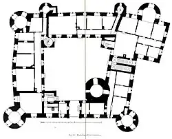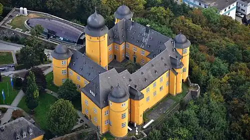 Das Schloss besteht aus einer Vorburg und einem zweigeschossigen Hauptgebäude, das mit seinen vier Gebäudeflügeln einen fast quadratischen Innenhof umschließt. An den Ecken besitzt es dreigeschossige Rundtürme, die eine flache, geschwungene Haube als Dach besitzen. Sein mittelalterlicher Bergfried ist 33 Meter hoch. Hofseitig treten drei Treppentürme aus der gelb gestrichenen Fassade.