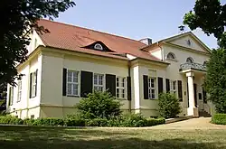 Das Bauwerk wurde 1801 als eingeschossiger verputzter Bau im Biedermeierstil an der Stelle eines Vorgängergebäudes errichtet und steht auf einem hohen Sockelgeschoss. Die Fassade gliedert sich in einen Mittelrisalit und Seitenrisalite. Zur Gartenseite besteht ein Portikus, zur Hofseite gibt es einen Balkon zur Auffahrt. Das Haus steht auf einer kleinen Anhöhe und ist von Gärten umgeben. Der Architekt ist unbekannt. Möglicherweise handelte es sich um einen Schüler von Friedrich Gilly.