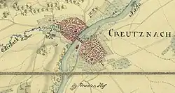 - ↑ Die neuere Topographische Aufnahme der Rheinlande (Blatt Nr. 212, 1811/12) durch Jean Joseph Tranchot (GeoPortal Rheinland-Pfalz) zeigt vereinzelt zusätzliche Gebäude in der Stadt; das Gelände des Oranienhofes ist 1811/12 schon bis zur Nahe bewirtschaftet und eingezäunt.