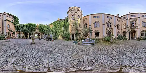 Von den zahlreichen Räumen des Schlosses sind als besonders prächtig hervorzuheben das kleine Speisezimmer mit durch Schnitzereien reich verzierter Decke, der Marmorsaal mit prächtiger Sternendecke[1] und die Waffenhalle.