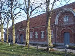 Der langgezogene Marstall wurde von 1745 bis 1750 durch Johann Gottfried Rosenberg erbaut und gilt als künstlerisch wertvollstes Gebäude dieser Art im Land Schleswig-Holstein.[5] Der aus unverputztem Backstein errichtete spätbarocke Bau bot Platz für 56 Pferde; die Skulpturendekoration nimmt auf diesen Zweck Bezug. Der Marstall diente während der Zeit des Internats als Turnhalle, heute sind hier Klassenräume, Sekretariat und Bibliothek der Meisterschule untergebracht. Rechter Hand des Marstalls befindet sich das ehemalige Lazarett. Der in den Jahren 1896/97 im wilhelminischen Stil aus Backstein errichtete Bau diente der Kadettenanstalt als Krankenhaus. Heute beherbergt er ebenfalls privat genutzte Wohnungen.