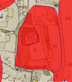 Von der ehemaligen Niederungsburg und dem späteren Schloss ist noch ein Burgstall im südöstlichen Ortsbereich auszumachen, der heute aber weitgehend eingeebnet bzw. mit einem Neubau überbaut wurde. In einer Flurkarte von 1817 war das mit einem Wassergraben umgebene Anwesen noch erkennbar. Auf dem Stich von Michael Wening von 1721 ist hier ein zwei- bis dreigeschossiges Gebäude mit Zwiebeltürmen an den Ecken zu sehen. Auf der Insel ist so viel Platz, dass auch ein gepflegter Barockgarten angelegt werden konnte. Die Anlage ist von einem Wassergraben umschlossen, über den eine einfache Brücke führt. Im Süden und Westen deutet sich eine verflachte Wallanlage an. In der Beschreibung durch Wening ist auch von einer Schlosskapelle, die dem hl. Nikolaus und der hl. Katharina geweiht war, die Rede. Diese war im Schlossgebäude untergebracht. Außerhalb stehen mehrere Wirtschaftsgebäude, wobei diese durch eine Mauer mit mehreren spitzgiebeligen Durchgängen umgeben und auch geschützt ist.