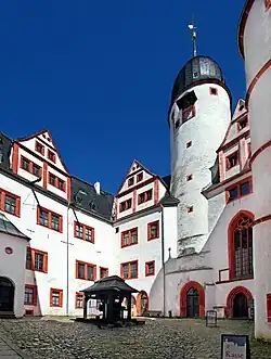 Am Bergfried ist die noch voll funktionsfähige Turmuhr von 1640 zu sehen. Es handelt sich um eine Einzeigeruhr mit originalem Uhr- und Schlagwerk, die bei Sonderführungen besichtigt werden kann. Zum Stundenschlag ertönt die 1620 in Zwickau für dieses Uhrwerk gegossene tontiefere Schlagglocke mit einer umlaufenden Inschrift: HANS•HAVBENDACHER•HANS•RAMIG•ZU•ZWICKAV•HAD•MICH•GOSSEN•ANNO•16•20. Eine tonhöhere Glocke von 1474 wird für jede Viertelstunde innerhalb der angebrochenen Stunde je einmal angeschlagen; Die volle Stunde wird durch vier Schläge bezeichnet. Diese Glocke trägt am Glockenhals die Inschrift: Anno•d(omi)ni•m°•cccc°•lxxiiii°. Es handelt sich dabei um eine ehemalige Läuteglocke, die nachträglich in eine Schlagglocke umgewandelt wurde. Ihre Herkunft ist ungeklärt, doch möglicherweise hing sie früher in einem Glockenträger der spätgotischen Schlosskapelle.[10] Die drei Steingewichte zum Antrieb von Werk, Zeiger und Glockenschlag können separat über eine Handkurbel mit Rollen aufgezogen werden. Seit der Restaurierung von 1999 mit Erneuerung des Ziffernblattes erledigt dies ein automatisch zugeschalteter Elektromotor.