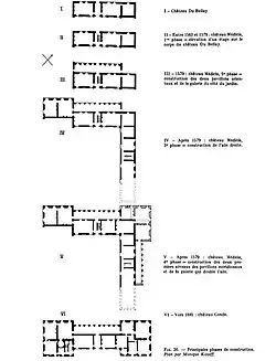 Die Bauarbeiten wurden bis 1563 unterbrochen, als die Königinmutter Caterina de’ Medici sie wieder aufnehmen ließ, nachdem sie das Schloss von Eustache du Bellay, dem Vetter und Erben von Jean und ebenfalls Bischof von Paris, gekauft hatte. Der Bau wurde durch neue Gebäude bereichert, die um 1570 von Delorme begonnen und nach dessen Tod um 1579 von Jacques I. Androuet du Cerceau umgestaltet wurden, der diese Erweiterungen in seinem Architekturbuch Les plus excellents bastiments de France darstellte. Zunächst handelte es sich um Konsolidierungen und Restaurierungen des bestehenden Gebäudes, dann um einige Erweiterungen. Es ist der Entwurf von Du Cerceau, der die Aufteilung weitgehend verändert, die Verzierungen übernimmt und der Fassade ihr Renaissanceaussehen verleiht.