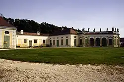 Im Herbst 1716 war das Schloss vollendet und die Maurer wurden zum Bau der Orangerie herangezogen. Diese weitläufige Anlage stammt ebenfalls von Hildebrandt selbst, ist das Hauptwerk der Gartenarchitektur und bildet selbst ein kleines Ensemble, das die Anlage des Hauptgebäudes wiederaufnimmt.[1] Sie liegt auf leicht erhöhtem Terrain. Es handelt sich um eine rechteckige Anlage von eingeschoßigen Bauten, die zwei Höfe umschließen.