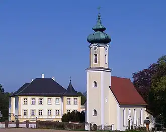 - Schloss; Hauptgebäude, dreigeschossige Barockanlage von 1676/80, Westfront mit kurzen Seitenflügeln, Ostfront mit Ecktürmen; laubenartiger zweigeschossiger Verbindungsbau zur Pfarrkirche; westlich Torhaus mit ehemaliger Jägerwohnung, Remise u.a. dreiflügelige Rokokoanlage mit Durchfahrt und Vorschußmauern zum Schloßplatz, Mitte 18. Jahrhundert; südlich ummauerter Ziergarten mit Wasserbassin.