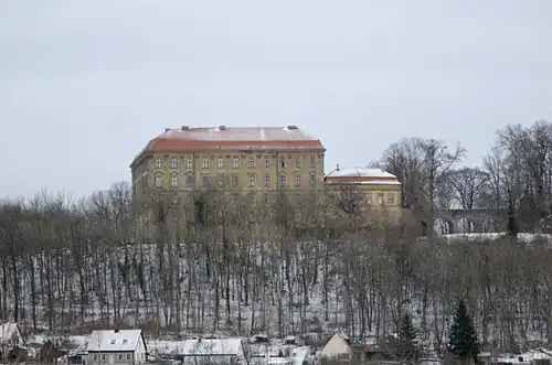 - das Schloss, eine dreigeschossige Dreiflügelanlage mit Ehrenhof, 1705–1740 im Wesentlichen von Louis Remy de la Fosse unter der Herrschaft des Grafen und späteren Fürsten Philipp Ernst zu Hohenlohe-Waldenburg-Schillingsfürst erbaut; mit doppelter Wallgrabenanlage; innere Grabenbrücke, fünfbogiger Quaderbau, wohl 18. Jahrhundert; äußere Grabenbrücke, einbogige Quaderbrücke, wohl 18. Jahrhundert[1]