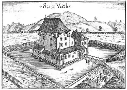 Wie auf dem Stich von Georg Matthäus Vischer von 1674 zu sehen ist, war St. Veit ein zweigeschoßiges Wasserschloss mit einem Walmdach. Der Teichrand war mit Hausteinen ausgemauert. An den Ecken des Schlossgebäudes befanden sich Scharwachttürme. An der Frontseite war noch ein Eckturm mit einer Zwiebelhaube. Eine hölzerne Brücke führte zu dem Gebäude. Rechts neben der Brücke befand sich eine ummauerte Brunnenanlage.