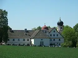 Das Gebäude liegt oberhalb der Isarhangleite. Es wurde Anfang des 20. Jahrhunderts als Gutshof errichtet. Es besteht aus einem zweigeschossigen Satteldach- bzw. Walmdachbau mit einem runden Ostturm, die in historisierenden Formen errichtet wurden. Auch die Einfriedung mit einem geschweiften Portal und die südlich gelegene Wegkapelle stammt aus dieser Zeit.