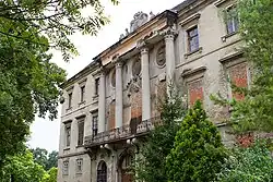 - „Der Anblick der sich nun bot, musste allerdings auf das höchste überraschen! Durch alte Platanen beinahe verdeckt, wuchs eine riesenhafte Palastfassade auf, über den mit reichen Schmiedegittern verzierten Toren durch himmelsstrebende Säulen gegliedert. Die Architektur von einer Größe und Pracht, wie sie uns sonst wohl an fürstlichen Stadtpalästen begegnet – und doch schien auch hier etwas nicht ganz richtig zu sein. Die Fenster des Hauptgeschosses umschlossen dunkle, mit Brettern verschlagene Höhlen und an Stelle der blumenbekränzten Giebel trugen sie unfertige, roh überbossierte Werkstücke eingesetzt. Aber welch reiches frohbewegtes Leben musste hier einstmals geherrscht haben! Gruppen entzückender Putten trieben auf der Brüstung des Wassergrabens ihr loses Spiel und an der Torbrücke hielten zwei festlich aufgeputzte Sphinxen in gelassener Ruhe Wacht. Dort aber, wo eine Balustrade den Vorplatz gegen den Garten abschloss, standen riesige Prunkvasen im Dickicht versteckt und drinnen im Park, dessen malerische Baumwildnis nichts mehr von der Planmäßigkeit der ursprünglichen Anlage ahnen ließ, erhoben sich, von dem Wirrsal wild aufsprießender Schösslinge fast erstickt, zwei Entführungsgruppen von elementarer Gewalt. Beim Ausgang fiel mein Blick auf zwei Fechtergestalten zu seiten des Tores, die hier am Ende einer alten Kastanienallee im mutigen Zweikampf die Arme kreuzten.“