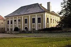 Der zweigeschoßige Vierflügelbau ist von einem Wassergraben sowie südlich und östlich von einer ursprünglich wehrhaften äußeren Mauer mit runden, bastionsartigen Ecktürmchen aus dem späten 16. Jahrhundert umgeben.[1] Das südöstliche Türmchen ist als barocker Pavillon ausgebaut.