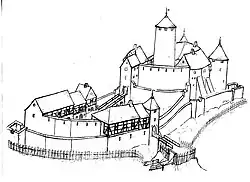 Vogt Heinrich III. erweiterte nach 1300 die Burg mit zwei zusätzlichen Rundtürmen (Westturm, Südturm) und baute den Palas und Bergfried weiter aus. Die Georgskapelle wurde, zuerst als alleinstehendes Gebäude, 1327 errichtet und in die Wehrmauer eingebunden.[4] Die hochgotische Bausubstanz der Kapelle ist in Form von Spitzbogenfenstern und Kreuzrippengewölbe weitgehend original erhalten. Als der Westturm hinzugefügt wurde, mussten die bis dahin bestehenden Abort-Nasen entfernt und auf einer anderen Stelle neu errichtet werden. Der Rest eines der ursprünglichen Abort-Nasen aus der Zeit vor 1300 ist rechts neben dem Westturm heute noch sichtbar. Ein weiteres Zeugnis der gotischen Bauweise des frühen 14. Jahrhunderts ist der Eingang zum „neuen“ Abort sowie der Türrahmen des Einganges zum Sockel-Raum des Westturms (Spitzbogentür).
