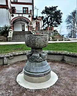 Eine ausladende Terrassenanlage hinter den Wohnräumlichkeiten ermöglicht den Zugang zur Gartenanlage. Hier sind auch die Treppen der Süd- und Ostseite anzumerken, die mit ihren steinernen volutierenden Brüstungen, die bepflanzt sind, ein schmuckvolles Bild bieten. Mittig der absteigenden Brüstung ruhen beidseitig auf einem Sockel große Steinvasen, welche gleichfalls bepflanzt sind.