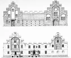 - jedoch wird am Terrakotta-Flügel auch dessen äußere Form aufwendig mit Rundbögen nebst Fächerrosetten und Steinfiguren gestaltet, wohingegen am Backstein-Flügel die sehr einfache Treppengiebel- bzw. Staffelgiebel-Form der Gotik fortbesteht.