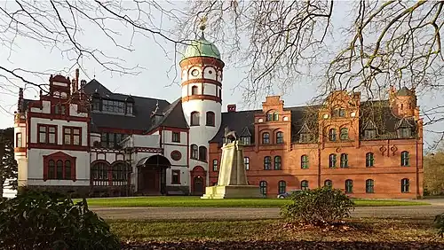 Weißer Hauptflügel, der rote Seitenflügel aus Backstein und das schwarze Dach stehen symbolisch für die Reichsfarben des 1871 gegründeten Deutschen Kaiserreiches.