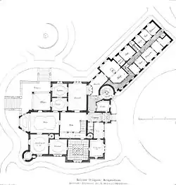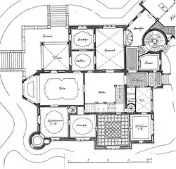 Zentral im Hauptflügel befindet sich die zweigeschossige Treppenhalle, um die herum im Erdgeschoss alle anderen repräsentativen Räume des Hauses in U-Form angeordnet sind (Gesellschaftsräume, Wohnräume und der Arbeits- und Repräsentationstrakt des Hausherren). Das Treppenhallen-Obergeschoss (mit gleichfalls U-förmiger Anordnung der weiteren Wohnräume – wie Schlafzimmer, Ankleidezimmer, Sanitärräume) wird durch eine Galerie erschlossen, zu der vom Erdgeschoss aus eine Repräsentationstreppe nach oben führt. Die jeweilige Raumanordnung im Erdgeschoss und Obergeschoss wird auf den nebenstehenden Grundrissen im Detail dargestellt.