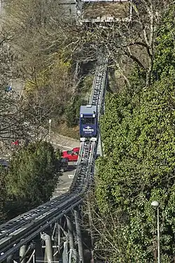 Im Gegensatz zu jener kann die neue Bahn auch Rollstühle, Kinderwagen und Rollatoren befördern. Die Bauten der Berg- und Talstation blieben erhalten. In letzterer befindet sich ein Kiosk, der sich seit 2014 Café Marcel nennt. Anfang 2021 wurde es ohne Veränderung der Fassade umgebaut.[1] Die Gebäude wurden zwar vom ehemaligen Mitarbeiter des Stadtplanungsamtes, Reinhard Schelkes, als architektonisch sehr wertvoll beurteilt, aber es besteht offiziell kein Denkmalschutz.[2]