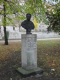 Friedrich Kleist von Nollendorf war ein preußischer Generalfeldmarschall der Provinz Sachsen, die ihren Sitz in Merseburg hatte. Er lebte und wirkte von 1815 bis 1821 in Merseburg. Seiner Verdienste wegen wurde 1825 im Schlossgarten eine Büste für ihn aufgestellt, gestaltet von Christian Daniel Rauch.[3]