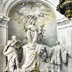 Die Kanzel wird getragen von einem lebensgroßen Engel in Hochrelief, neben dem ein Engelkind ein Spruchband entrollt:
